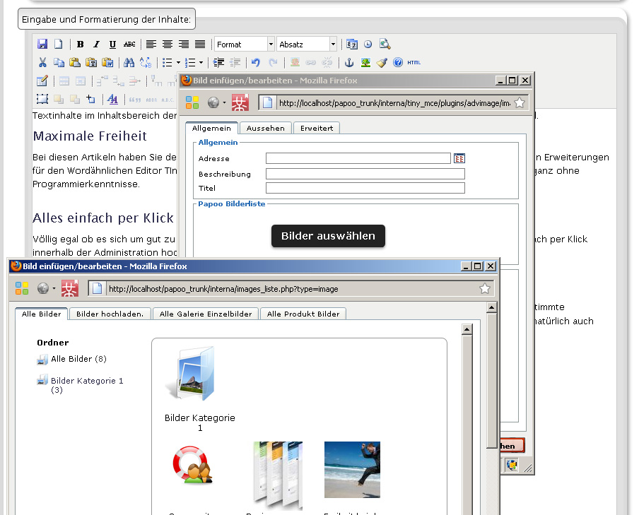 Bei diesen Artikeln haben Sie alle Freiheitsgrade die man sich vorstellen kann. Mit Hilfe unserer starken Erweiterungen für den Wordähnlichen Editor TInyMce© können Sie völlig flexibel Ihre Inhalte auf die Webseite bringen, und das ganz ohne Programmierkenntnisse.